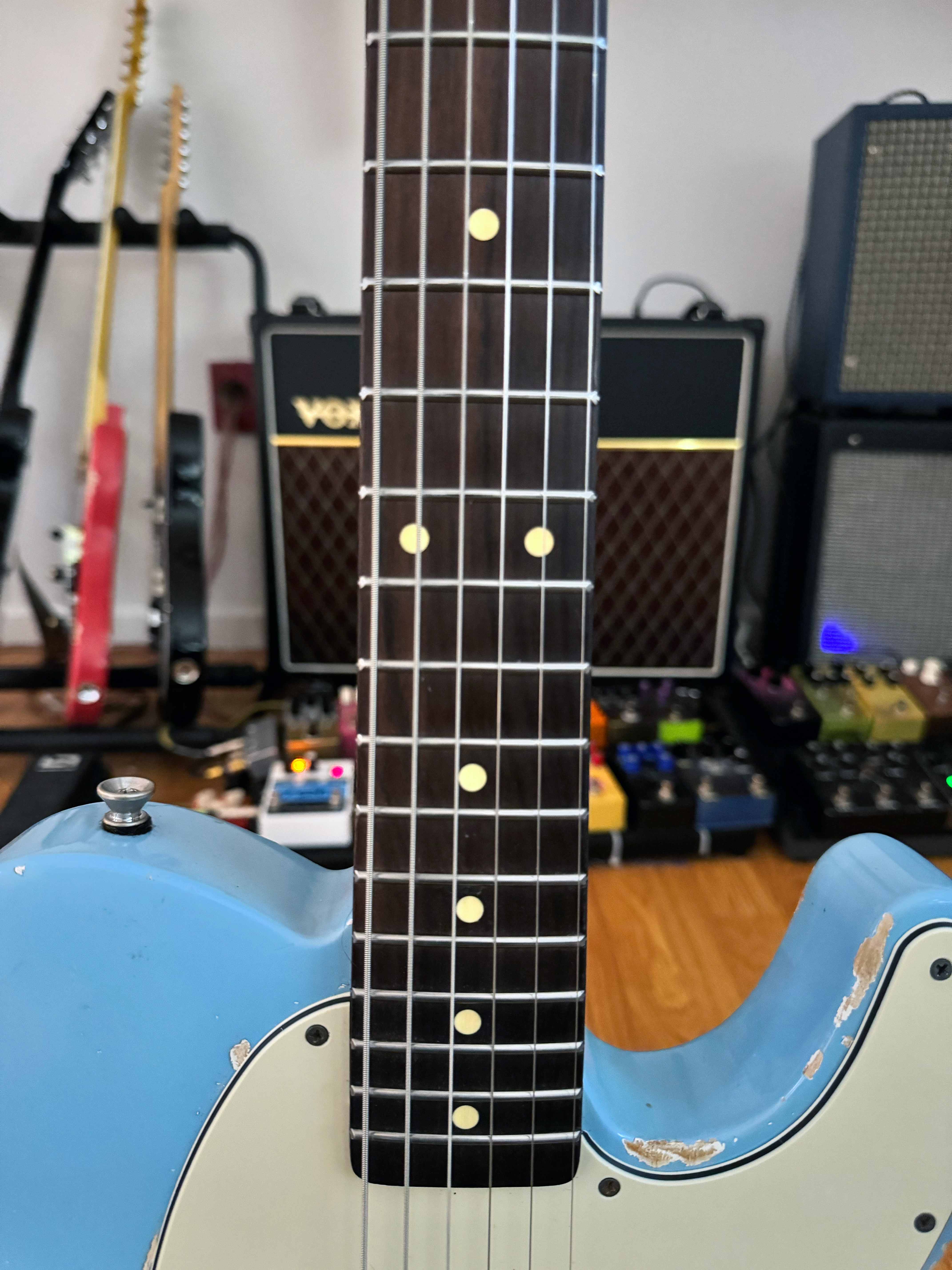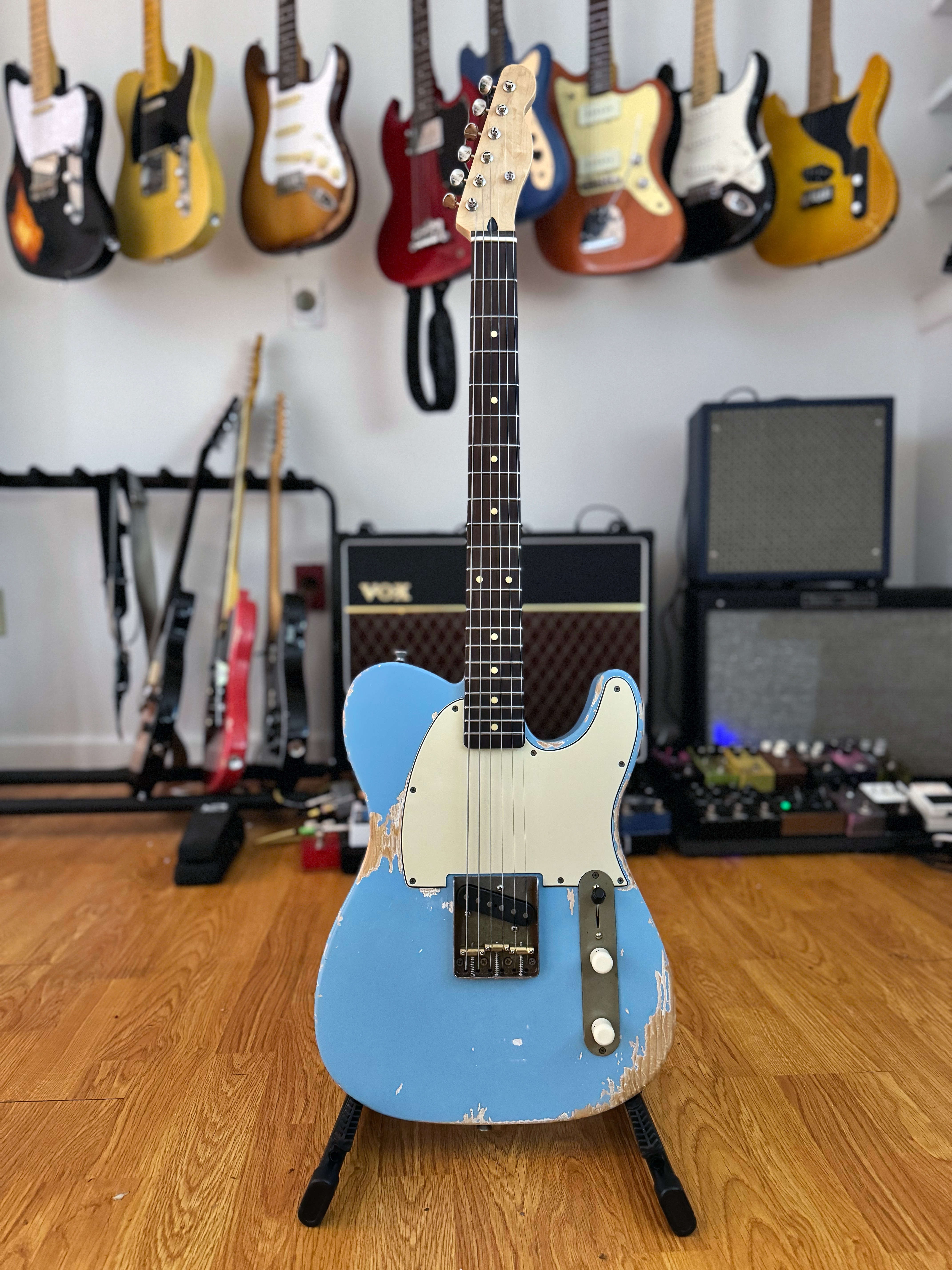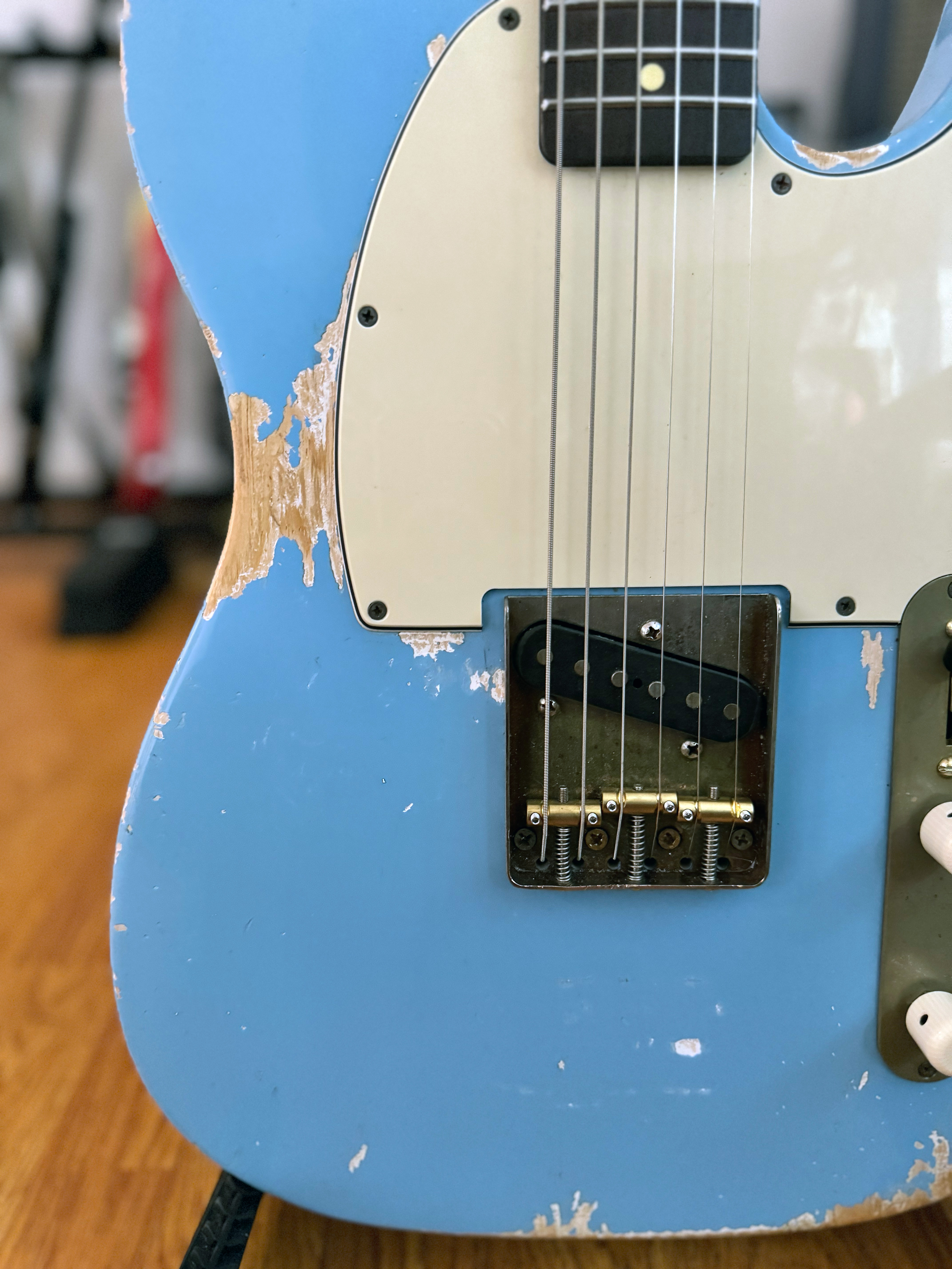 The Quint Guitars #04 Esquire is a lovingly crafted T-style guitar that combines vintage aesthetics with modern playability. Built with premium components and meticulous attention to detail, this guitar features a lightweight pine body finished in a beautiful relic Daphne Blue nitro by MJT.