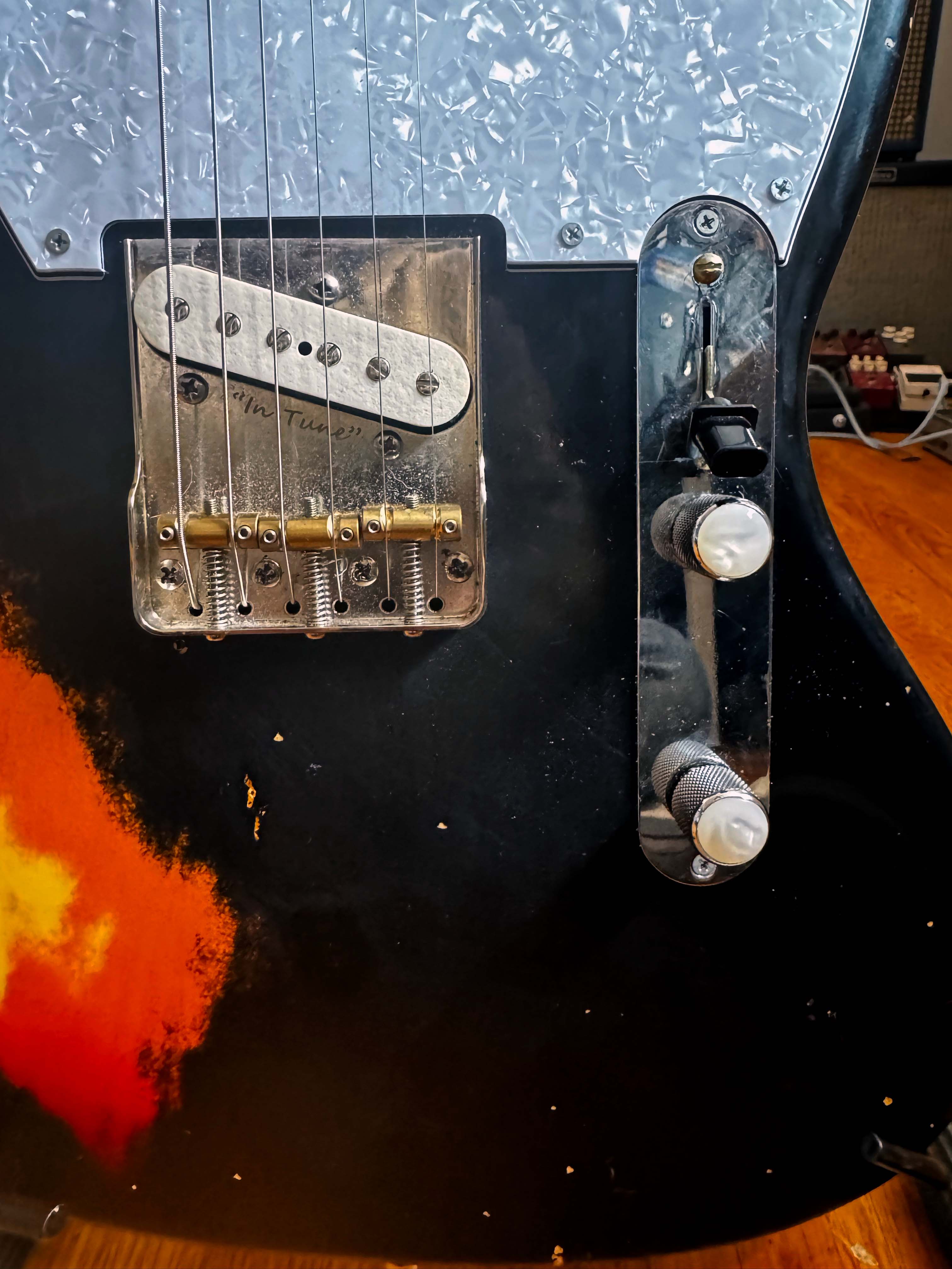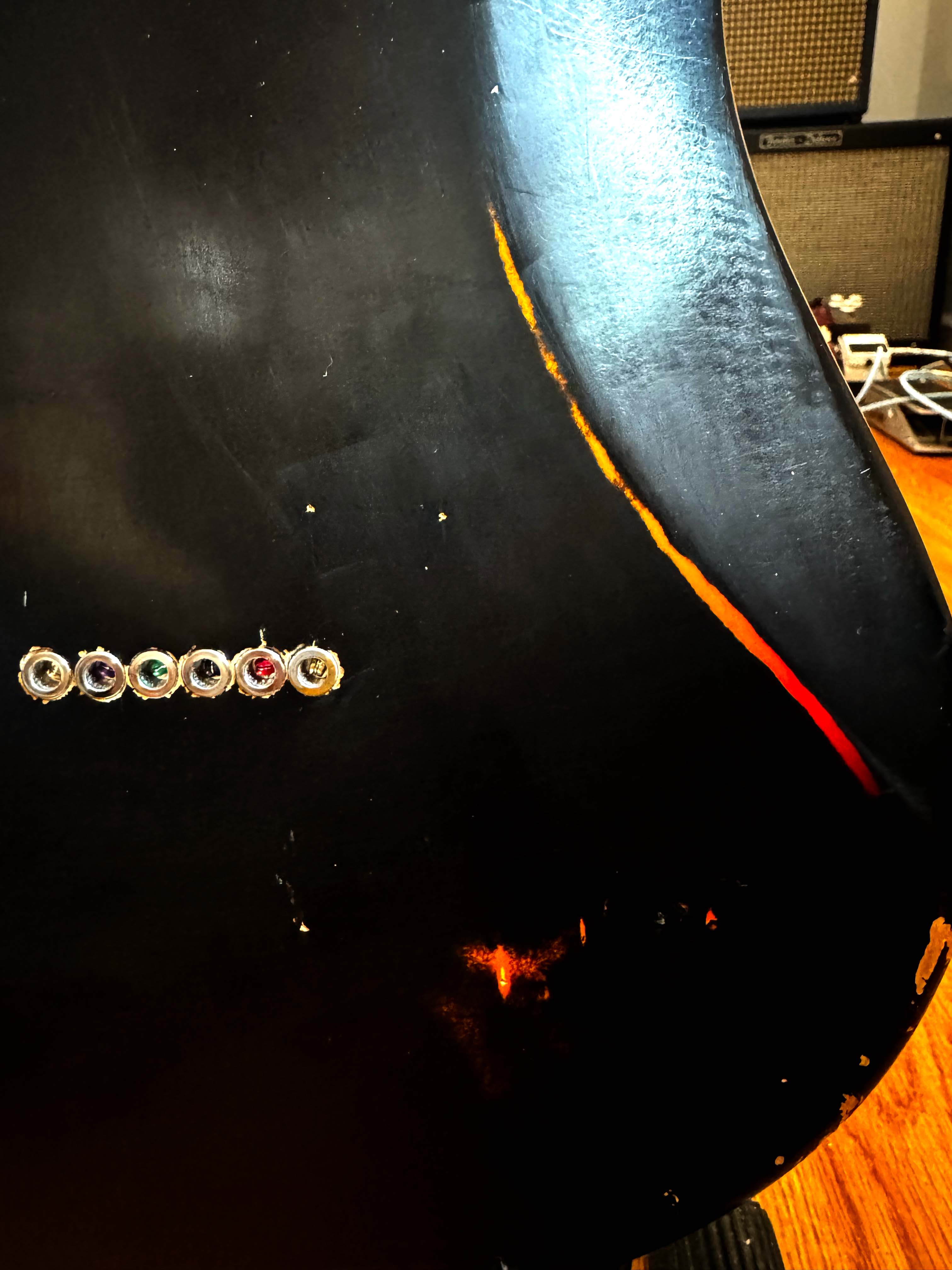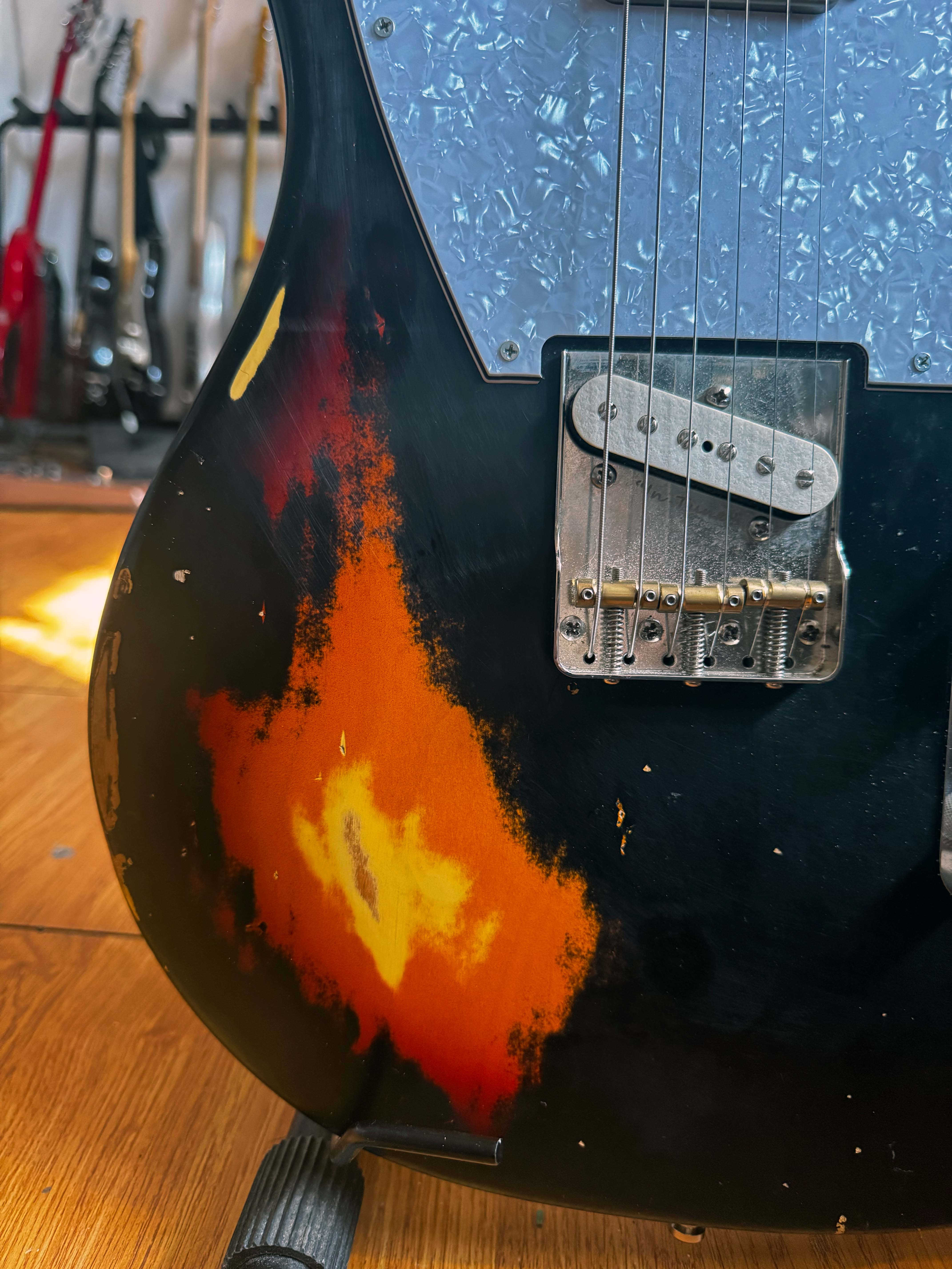 The black over sunburst finish on the body and headstock is one of a kind. The nitro finish will continue to wear over time, but right now gives a beautiful pattern.