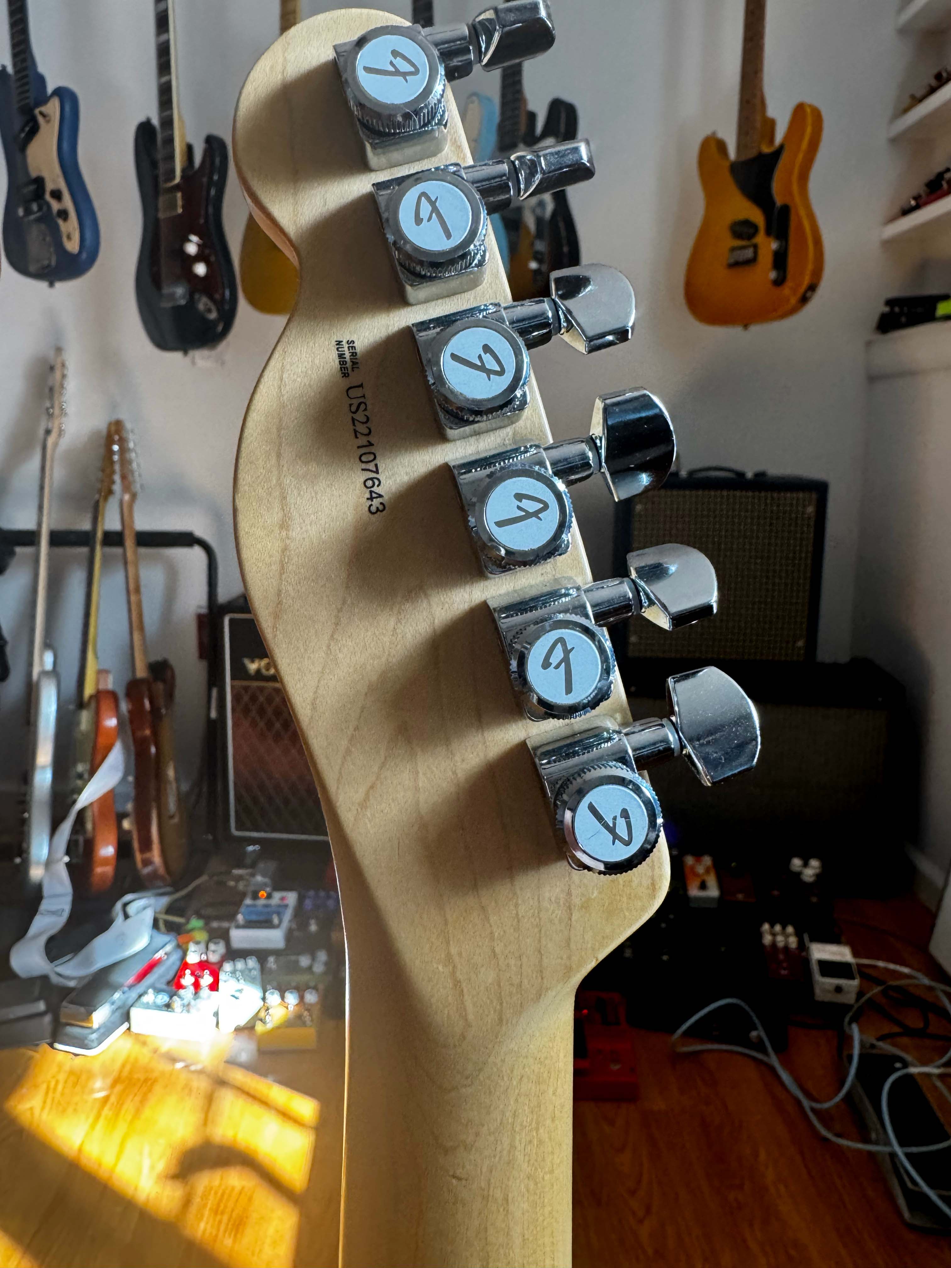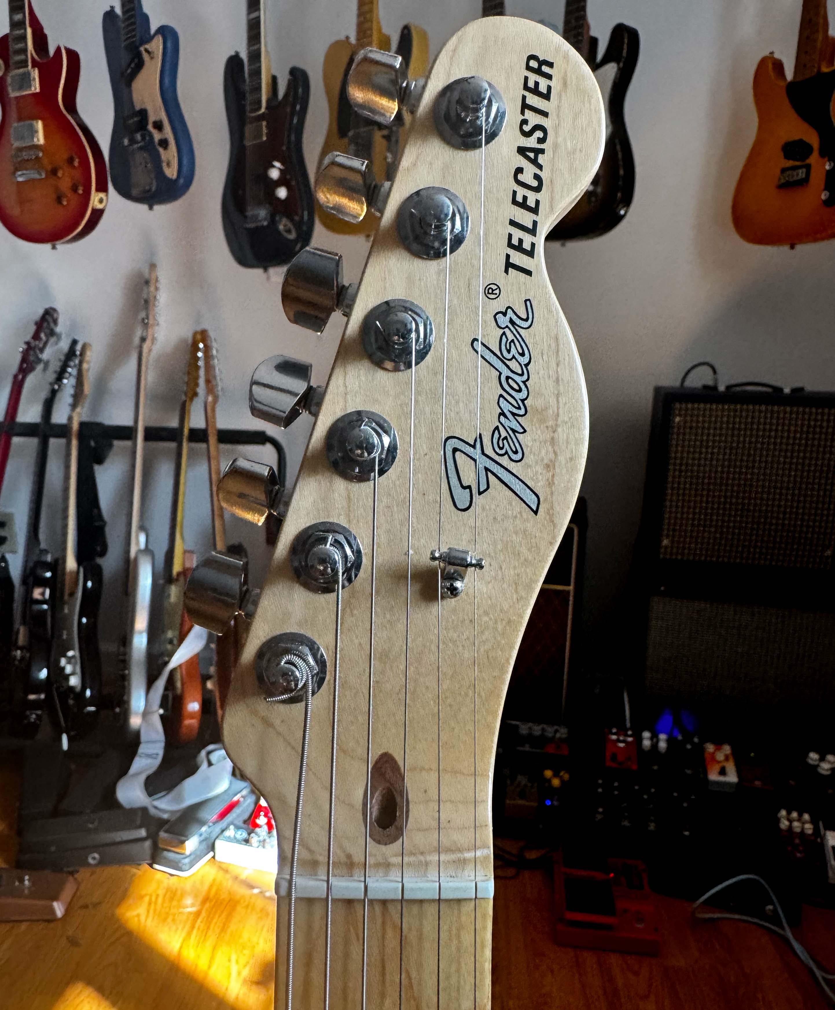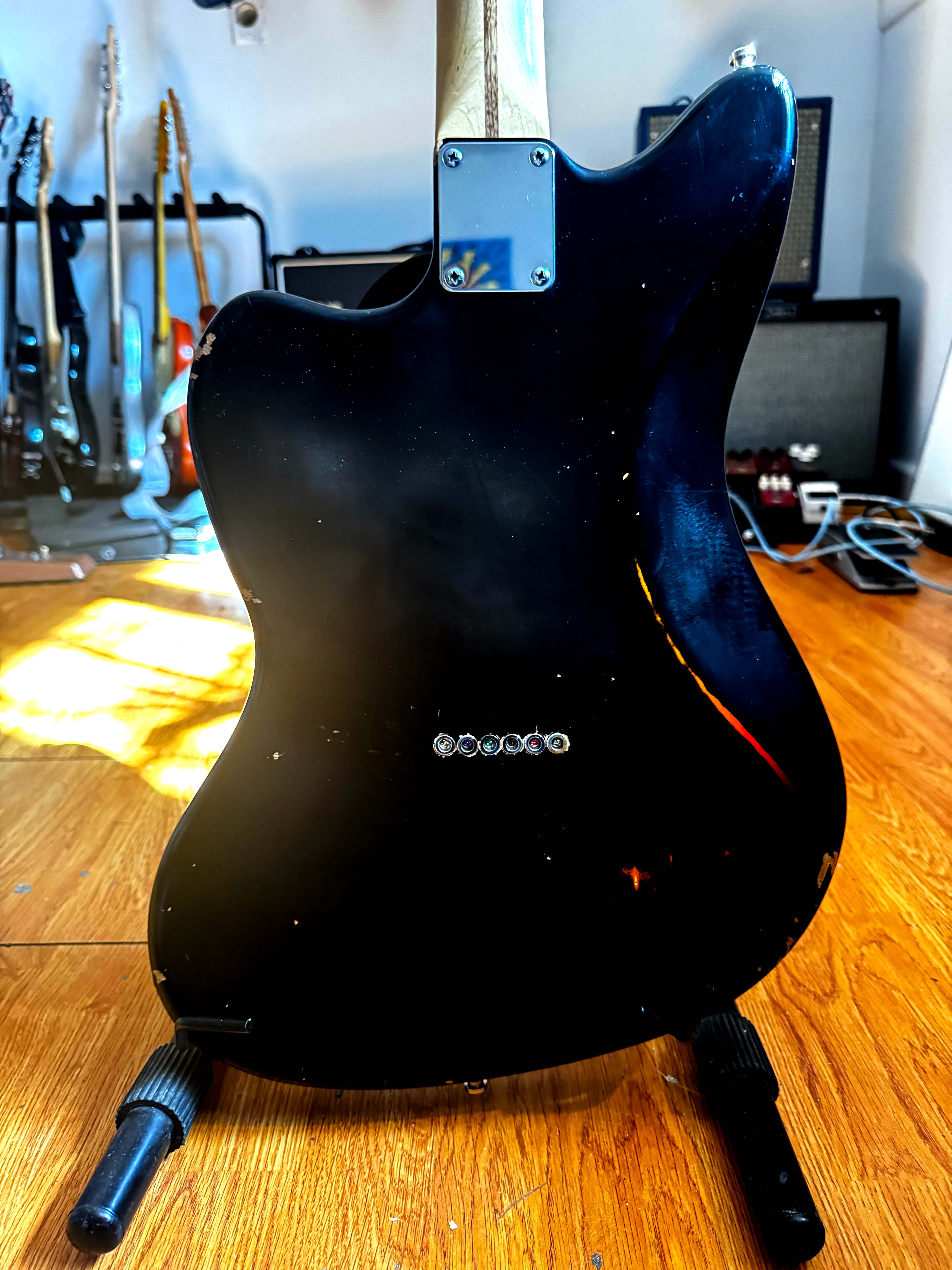 The black over sunburst finish on the body and headstock is one of a kind. The nitro finish will continue to wear over time, but right now gives a beautiful pattern.
