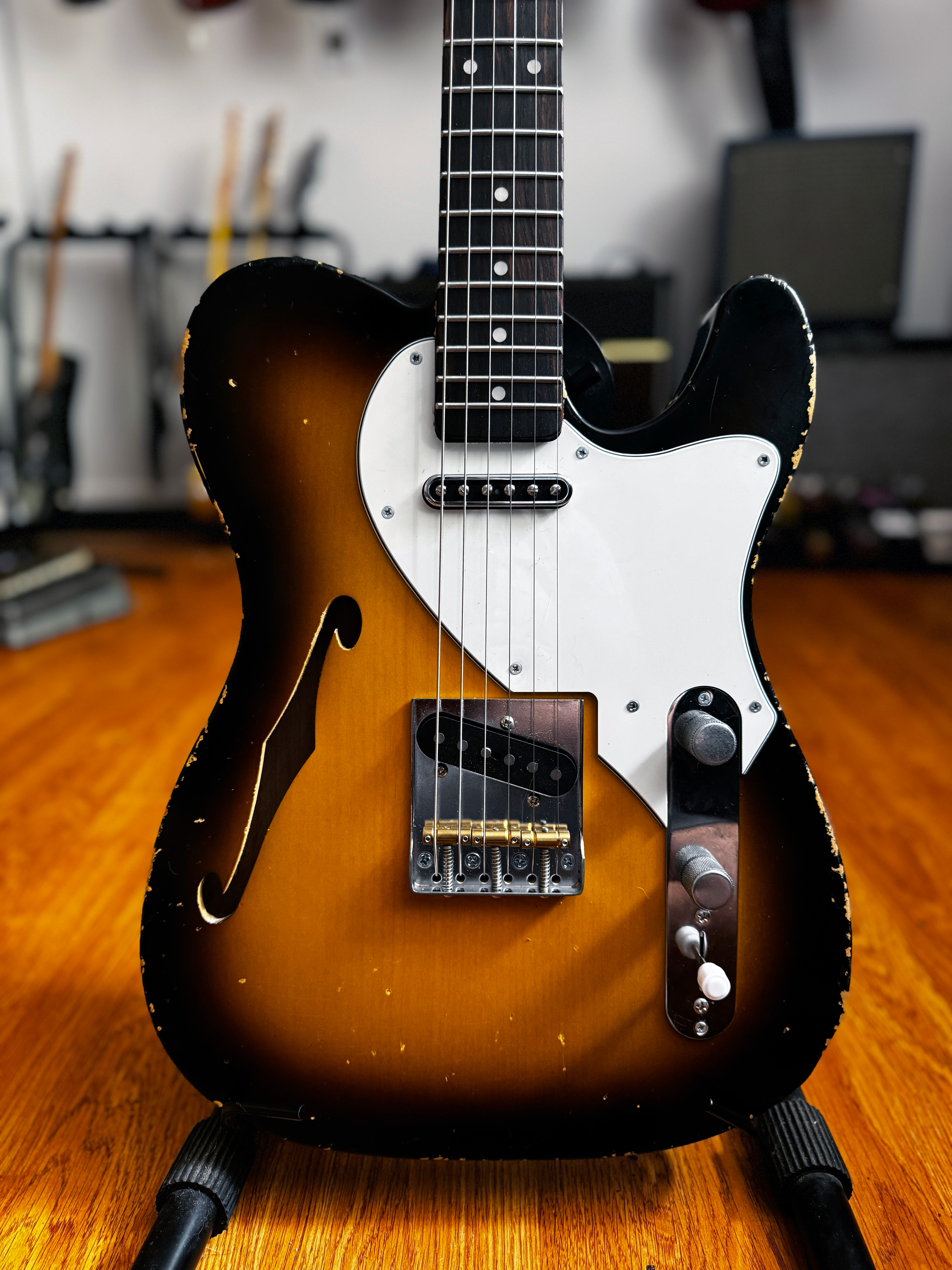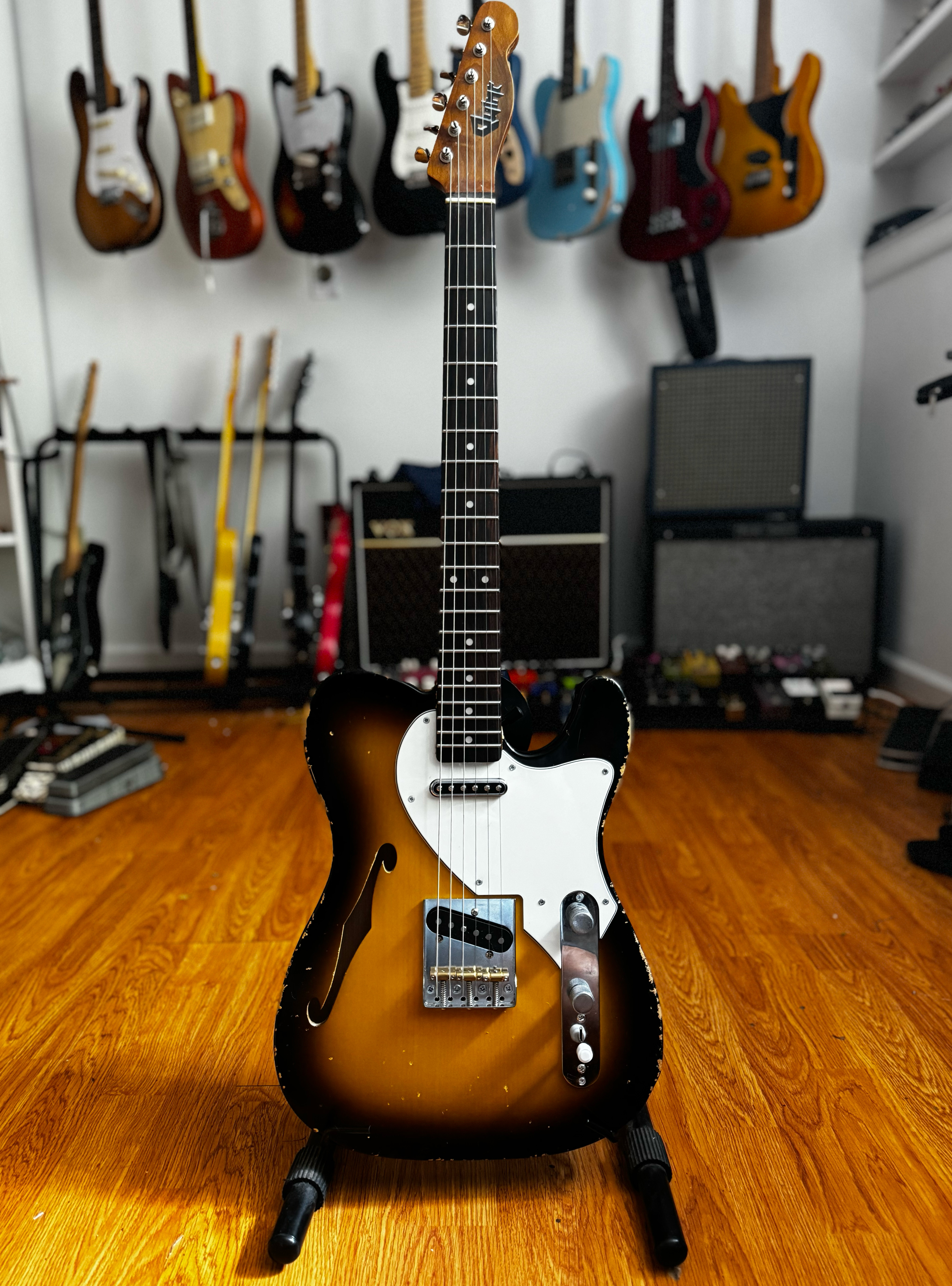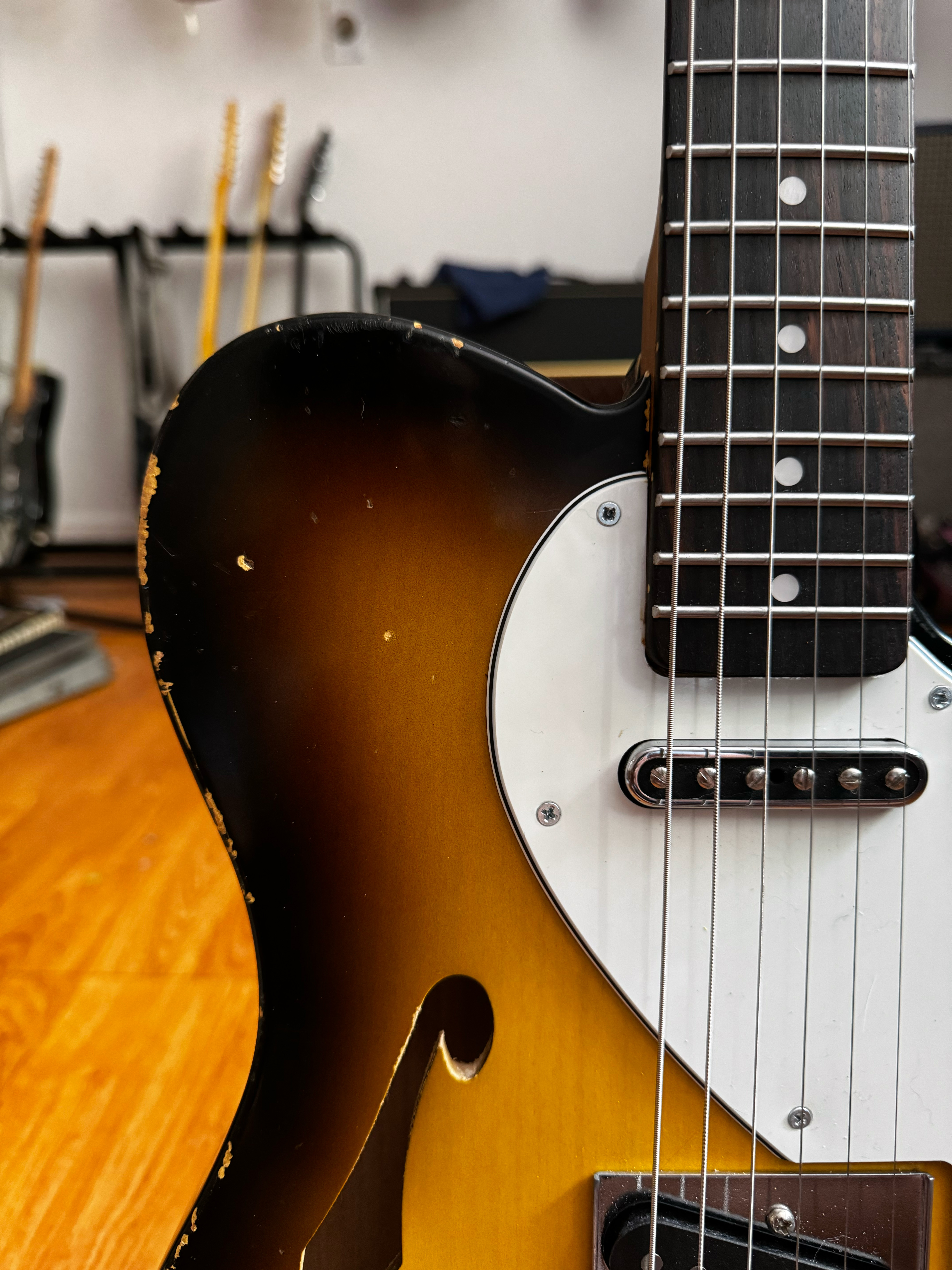 - Beautiful pine semi-hollow body with stunning woodgrain visible through the finish